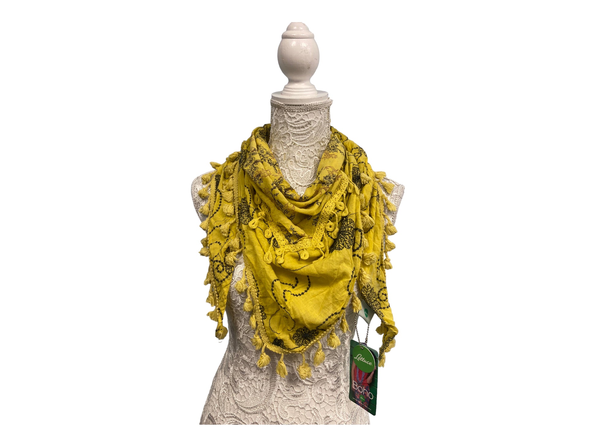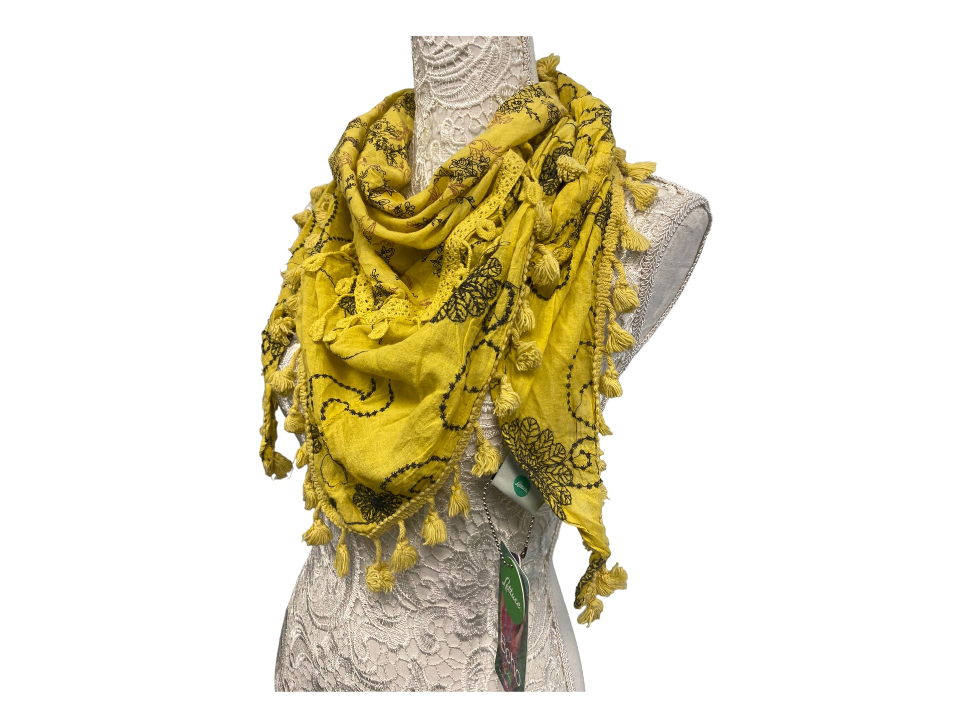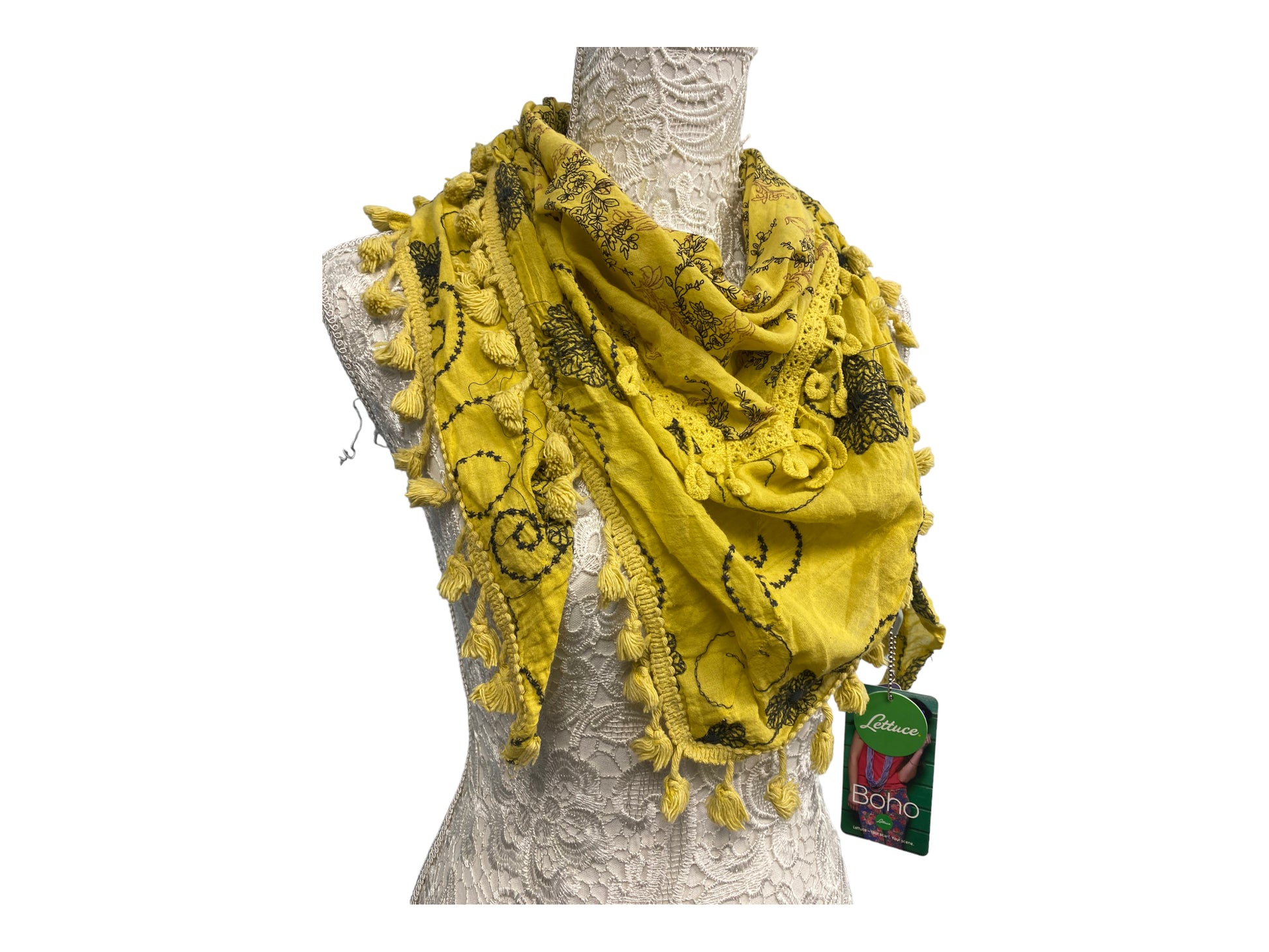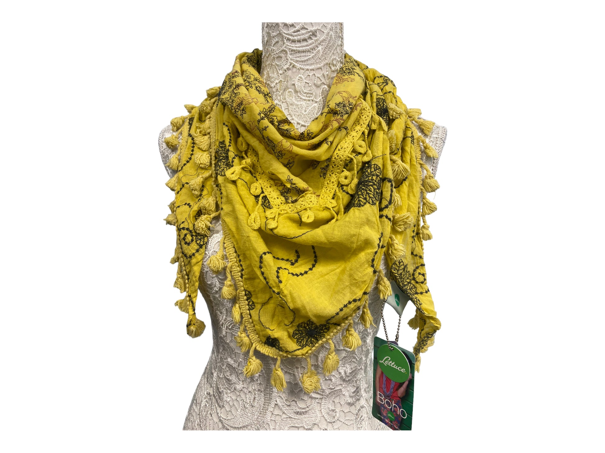 Pretty Yellow 100% cotton Embroidered Lace , Boho Hippy Tassel scarf, triangular, Gift