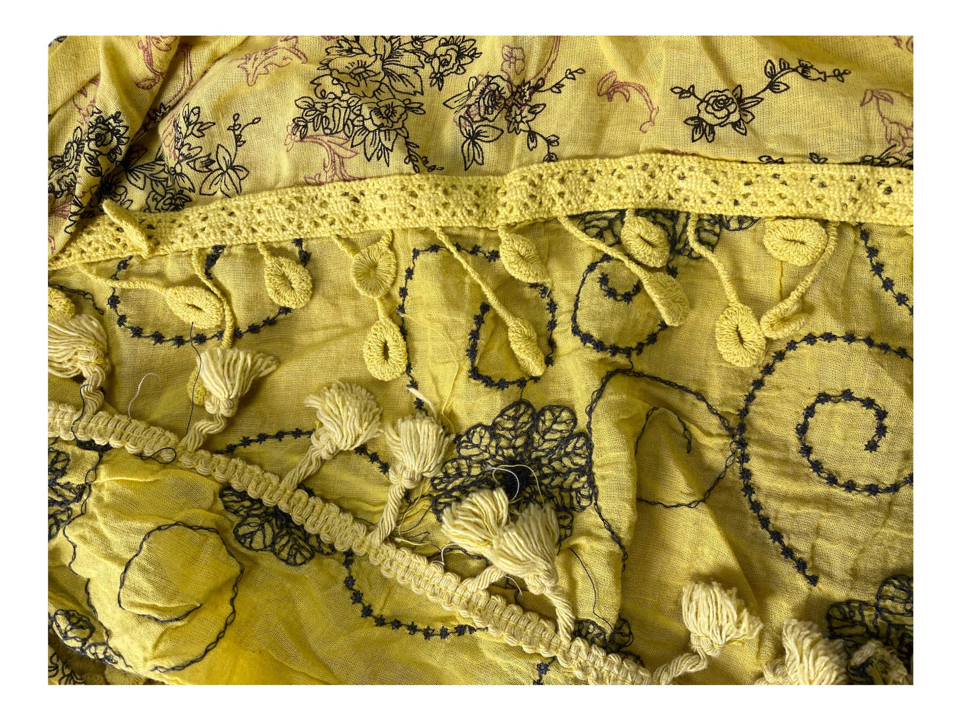 This scarf is triangluar in shape, so sits beautifully around the neck. Long length, the fabric is Embroidered in a floral design in a fine black thread. Pretty little tassels all around the edge and lace detailing in the middle.