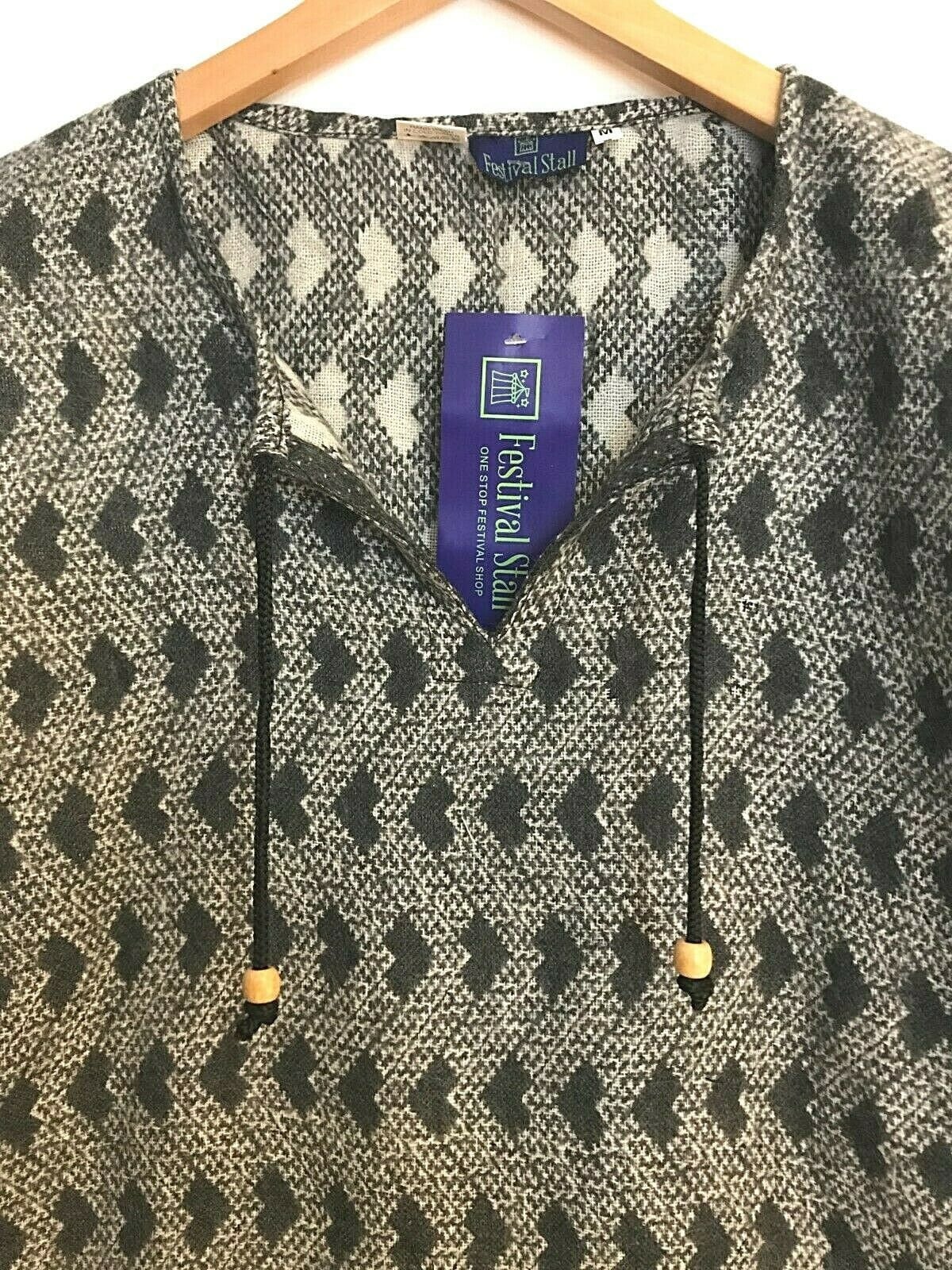 Boho Long Grey diamond heart design ethnic Festival embroidery tasselled tunic Beautiful warm stylish tunic with tasselled fringe hem. Two front pockets. Pullover style with deep side slits for a comfy fit. Tie at the neckline with two wooden beads. Looks great with a pair of jeans or leggings teamed up with a pair of walking boots. Lovely and warm . Made in thick woven fabric, 100% acrylic SIZES UK 12-14 Underarm to underarm 20in (51cm) Waist 40in ( 102cm) Hips 46in (120cm)Length of sleeve from underarm to cuff 18in (46cm) Length 35in (90cm)Machine washable on a cool wash. Check out other colours in our shop Fancy something new? Find your fashion passion - Take a peek in our shop!