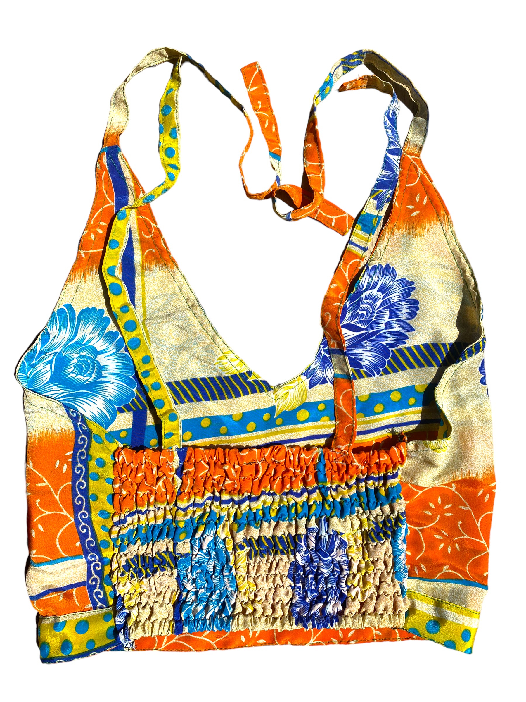 Get ready for summer with this gorgeous Recycled Sari Silk Crop Top, soft and silky against the skin, adjustable over the shoulder ties and a smocked back for the perfect fit. Lightweight and cool, great for holidays, team this up with a skirt, shorts or trousers and find your Bohemian spirit. Feel great in sustainable recycled clothing that you will wear time and time again.
